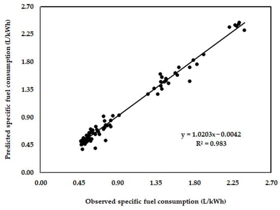 Volumetric measurements of fuel usage were taken for every field run. As demonstrated in Table 3, the results indicate that the chisel plow’s plowing speed increased from 3.7 km/h to 6.9 km/h by a percentage of 86.5%, as shown in Figure 6. Additionally, the fuel consumption (L/h) increased by 43.7%, the draft force (kN) by 15.6%, the drawbar power (kW) by 115.5%, and the OEE (%) by 50%. In contrast, the specific fuel consumption (L/kWh) decreased by 33.3%; however, consuming less fuel (L/kWh) is imperative and vital to decrease input costs for agricultural production processes (the data are shown in Table 3). On close examination of Figure 5, we discover the linear behavior of the specific fuel consumption with a determination coefficient higher than 0.95 for both datasets, observed and predicted using an ANN model after analyzing the impact of plowing speed on the specific fuel consumption (L/kWh) under investigation. In the study of Zimmermann et al. [62], they determined a second-order polynomial for specific fuel consumption per draft power through harrowing operations in the range of a forward speed of approximately 5.5 km/h to approximately 9.5 km/h, with a coefficient of determination greater than 99%. While the other examples in the study used less energy and did not differ among themselves, the slower speed required more energy for each produced potency. By using a chisel plow at 6.90 km/h, the lowest recorded specific fuel consumption (0.525 L/kWh) was achieved. The findings agree with the data obtained by Ranjbarian et al. [28]. The values observed and the predicted specific fuel consumption in this study compared to the range obtained by Klanfar et al. [32], who used a diesel fuel density of 0.850 kg/L (0.235–0.245 L/kWh) for given engine powers, perhaps due to the draft power being different to the implement-equivalent tractor power take-off. However, to assess the energy efficiency of tractors with various engine sizes and operating conditions, specific volumetric fuel consumption is utilized, as it is typically unaffected by engine size. The standard range of SVFC for diesel engines is 0.0476 to 0.1110 gal/hp-h [63]. In general, it is clear that the observed tractor-specific fuel consumption per draft power was a lower amount compared to the ANN prediction value with an average error of −0.349 L/kWh. However, this difference may be attributed to the values of draft power; thus, this demonstrates the ability of the created ANN model to predict tractor-specific fuel consumption per draft power. However, for professionals to evaluate the vehicle’s economy and to provide precise information regarding fuel utilization, an accurate fuel consumption model is essential [64].
