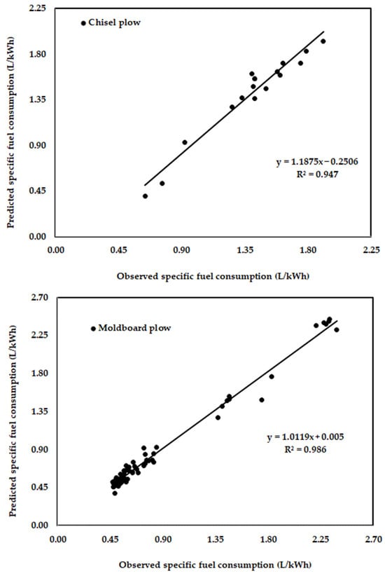 Regression of plowing speed in relation to tractor-specific fuel consumption per draft power (L/kWh) for chisel plow using observed and ANN-predicted values.