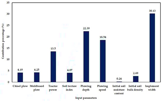 The independent variable made different contributions to the tractor-specific fuel consumption prediction of tractor–chisel and –moldboard combinations using the ANN model of 9-22-1. As clearly shown in Figure 7, monitoring the implement width occupies the largest percentage of contribution (30.13%), showing the importance of using suitable implement width at selecting a plow for soil tillage. Additionally, the chisel and moldboard plows contributed 4.19% and 4.25% in predicting tractor fuel consumption per draft power (Figure 7). Moreover, plowing depth and speed were 22.39% and 18.54%, respectively (Figure 7). The two factors are important and have different effects on fuel consumption and draft force, as indicated in different research papers. Increasing the plowing speed from 0.51 to 1.45 m/s led to a decrease in fuel consumption per unit draft power of 135% [61]. This is due to the fact that an increase in plowing speed leads to an increase in traction requirements; thus, the amount of fuel consumed based on traction power decreases. The soil texture index contributed by 4.07% to specific fuel consumption predictions; however, Kim et al. [47] reported that draft forces were different and consequently so was fuel consumption.