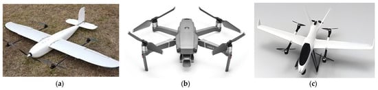 Examples of different types of drones. (a) Fixed-wing UAV, (b) Multi-rotor UAV, (c) Vertical Takeoff and Landing UAV.