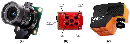The sensor is one of the basic components of the UAV, and the UAV collects various kinds of data through various sensors such as air pressure sensors, used to measure atmospheric pressure to infer altitude; GPS modules, used to determine the position of the UAV, navigation, and track planning; vision sensors, including cameras, infrared cameras, and other optical sensors, are used by UAVs to collect images, videos, and other data, and are widely used in aerial photography, monitoring, survey, and other tasks. As a result, drones can be equipped with different types of vision sensors, including RGB sensors, hyperspectral sensors, multi-spectral sensors, infrared sensors, and thermal imaging. Due to the small load characteristics of multi-rotor UAVs, fixed-wing UAVs and VTOL UAVs are more suitable for more complex cameras. In this section, we will highlight the vision sensors that are most commonly used in the literature for UAV data acquisition. Three common types of sensors are listed in Figure 2.