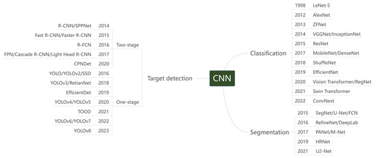 With the continuous development of deep learning technology, it has been applied more and more widely in various fields, among which CNN is one of the representative algorithms of deep learning, which has been applied more and more in image feature extraction and has made great progress. Different from the traditional shallow neural network, CNN has a multi-layer neural network structure, and each layer network consists of a different number of convolutional nuclei with different receptive field sizes. The convolutional layer and the previous layer in CNN are connected by local connection and weight sharing, which greatly reduces the complexity of the network and the number of weights. There are two main processes of CNN: One is the feature extraction process, which consists of alternating connections between the convolution layer and the pooling layer. The convolution layer abstracts the color, edge, and image feature information of the upper data. The pooling layer reduces the dimensionality of the data, reduces the feature information of the image, retains only the most important feature information, divides the features, and obtains the statistical information of each region, which helps to improve the generalization ability of the model [45]. The other is the process of classification, including the full connection layer and classification layer. The fully connected layer integrates the features extracted from the previous layer, associates the learned feature representation with labels, and each node of the layer is connected with all nodes of the previous layer and converts the output two-dimensional feature map into a one-dimensional vector to prepare for the subsequent classification task. The classification layer is responsible for completing the classification function of the model, which is usually composed of a number of fully connected layers, each of which performs linear and nonlinear transformations on the input data and gradually abstracts the higher-level feature representation. In the classification layer, the output of the network is usually a probability distribution for each category, and the model updates the parameters by comparing the difference between the probability distribution and the true label to minimize the classification error. Figure 3 shows the Basic convolutional neural network structure diagram. Convolutional neural networks can be divided into object detection, image classification, and image segmentation according to their application targets and task properties. With the continuous in-depth research of scholars, various types of networks are constantly being developed and optimized to improve their performance in different tasks. As a result, many variations of pre-trained neural networks are common in research, and we will focus on three network models in agriculture in this section. Figure 4 summarizes the development history of various network algorithms commonly used in convolutional neural networks.