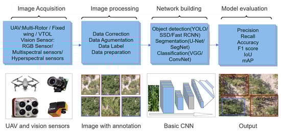 Drone technology and deep learning technology are two hot topics in the field of agricultural science and technology today; they are constantly developing in their respective fields and are widely used in various tasks in the field of agriculture. In weed management, deep learning technology can be used to identify different types of weeds, process farmland data, quickly and accurately locate the location of weeds or the difference between weeds and crops, and finally achieve accurate weeding operations. Therefore, the use of deep learning in weed management is increasing, and researchers have made a lot of efforts to study how to use deep learning algorithms in combination with other techniques to improve the efficiency of weed management tasks. Some studies combine deep learning technology with satellite remote sensing technology [67], but satellite images have the defects of low spatial and temporal resolution and no detailed information, which will affect the accuracy of deep learning algorithms and are more suitable for the research and analysis of large objects. The low-altitude drone platform can collect more detailed information about the type and status of weeds, which is superior to satellite images. Drones are flexible, efficient, and accurate. According to its characteristics, the application of UAV in weed management mainly focuses on weed data collection [68], field monitoring [69], assisted weed mapping [70], weed crop row detection [71], and herbicide spraying. The UAV is equipped with various sensors to realize real-time monitoring of farmland, data collection, auxiliary mapping, and crop row detection, providing more accurate data support for farmland management. Compared with traditional spraying methods, UAV spraying can greatly improve the efficiency and spraying effect of agricultural operations, reduce the use of pesticides, and reduce environmental pollution. In recent years, UAV-based remote sensing technology and deep learning technology have changed the mode of agricultural operations, and they provide strong technical support for intelligent weed management in farmland. Researchers have made numerous experiments and hypotheses about how to combine these two advanced technologies. The experimental data proved that the efficiency, precision, and environmental protection of weed management were greatly improved. This section will focus on the application of technologies based on drones and deep learning to weed management in farmland. Figure 5 shows the workflow of combining UAV and Convolutional neural network technologies.