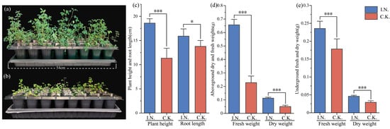 Differences in plant height, root length, and dry and fresh weights both above and below ground. (a,b) show phenotypic differences between symbiotic and C.K. plants at 35 dpi. (c) shows plant height and root length differences between symbiotic and C.K. plants. (d,e) show differences in above- and belowground fresh and dry weight between symbiotic and C.K. plants. * indicates p < 0.05, denoting a statistically significant difference; *** indicates p < 0.001, denoting a highly statistically significant difference. This experiment involved symbiotic plants inoculated with rhizobia and a control group of uninoculated plants.