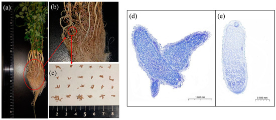 Changes in nodulation and nitrogen fixation capacity following rhizobial inoculation. (a–c) show the nodulation and nodule size of symbiotic plants at 35 dpi; (d,e) show toluidine blue-stained sections of pink and white nodules.