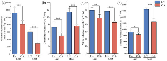 Activities of GOGAT, G.S., NiR, and N.R. in the leaves and roots of symbiotic and C.K. plants. (a) Glu-tamate synthetase (GOGAT) activity in leaves and roots of symbiotic plants and C.K. plants; (b) is glutamine synthetase (G.S.) activity in leaves and roots of symbiotic plants and C.K. plants; (c) Nitrogen reductase (NiR) activity in leaves and roots of symbiotic plants and C.K. plants; (d) Nitrate reductase (N.R.) activity in leaves and roots of symbiotic plants and C.K. plants. * indicates p < 0.05, denoting a statistically significant difference; ** indicates p < 0.01, *** indicates p < 0.001, denoting a highly statistically significant difference.