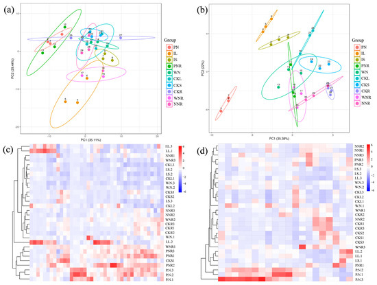 Regarding central carbon metabolites, we found that P.N. had significantly higher levels of PEP, AMP, ATP, sedoheptulose 7-phosphate, GDP, and NAD+ relative to PNR. Conversely, PNR had significantly higher levels of lactic acid and pyruvate than P.N. Additionally, W.N. had significantly higher levels of 6-phosphogluconic acid, succinate, 7-phosphoheptose, and NAD+ than WNR. However, the content of isocitrate, PEP, and cis-aconitic acid in WNR was significantly higher than in W.N. Furthermore, the content of PEP in WNR was 12.32 times higher than in W.N. During the P.N. vs. PNR group comparison, we identified four differentially produced central carbon metabolites, two of which were upregulated, and the most upregulated metabolite of which was succinate. Conversely, two metabolites were downregulated, with cis-aconitic acid showing the strongest downregulation (Figure 11c). Finally, the W.N. vs. WNR group comparison exhibited five differentially produced central carbon metabolites, of which three were upregulated, including the most upregulated, lactic acid. Conversely, glucose 6-phosphate showed the lowest level of expression (Figure 11d).