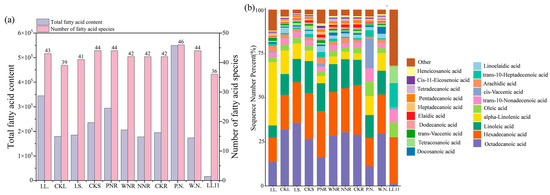 Total F.A. content and relative abundance in the tissues of symbiotic and C.K. plants. (a) the total content and types of fatty acids in different tissues of symbiotic plants, C.K. plants, and S. meliloti LL11; (b) the abundance of various fatty acids in different tissues of symbiotic plants, C.K. plants, and S. meliloti LL11.