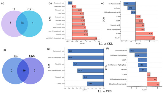 Differences in F.A. species abundance in leaves and stems. Venn diagram and bar charts depicting the profiles of differential metabolites are shown. The abscissa is the log2FC of the differential metabolites and the ordinate shows differential metabolite expression. Red represents upregulated differentially expressed metabolites, and blue represents downregulated differentially expressed metabolites. F.A.s, fatty acids; CCM, central carbon metabolism. Red represents downregulation and blue represent upregulation. (a,d) are the Venn diagrams of common fatty acids in I.L. vs. CKL and I.S. vs. CKS, respectively; (b,e) are the bar graphs of the number of up-and down-regulated fatty acid metabolites in I.L. vs. CKL, I.S. vs. CKS; (c,f) are the bar graphs of the number of up-and down-regulated carbon metabolites in the difference center of I.L. vs. CKL, I.S. vs. CKS.