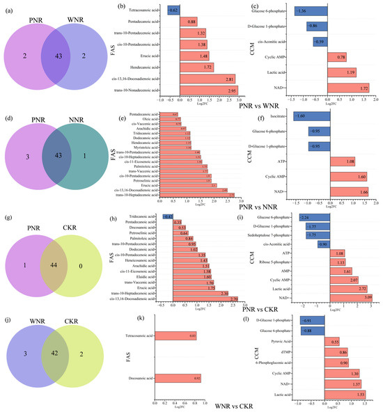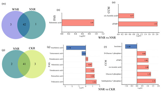 Differences in root F.A. species, as revealed by Venn diagrams and differential metabolite expression bar charts. (a,d,g,j,m,p) are denoted as PNR vs. WNR, PNR vs. NNR, PNR vs. CKR, WNR vs. CKR, WNR vs. NNR and NNR vs. CKR identical fatty acid Venn diagram, respectively. (b,e,h,k,n,q) were expressed as PNR vs. WNR, PNR vs. NNR, PNR vs. CKR, WNR vs. CKR, WNR vs. NNR and NNR vs. CKR, respectively. (c,f,i,l,o,r) are respectively expressed as the number of up and down bars of carbon metabolites in PNR vs. WNR, PNR vs. NNR, PNR vs. CKR, WNR vs. CKR, WNR vs. NNR and NNR vs. CKR. Red represents downregulation and blue represent upregulation.
