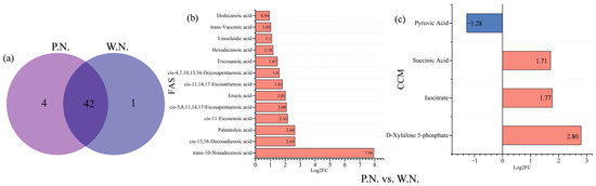 Differences in F.A. species among root nodules, as visualized by a Venn diagram and metabolite bar charts. (a) is the Venn diagram of P.N. vs. W.N. common fatty acids; (b) is expressed as a bar chart of the number of up-and down-regulated fatty acid metabolites in P.N. vs. W.N.; (c) is expressed as a bar chart of the number of up-and down-regulated carbon metabolites in the P.N. vs. W.N. difference center. Red represents downregulation and blue represent upregulation.