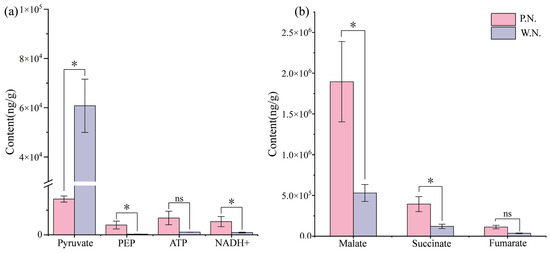 P.N. and W.N. tricarboxylic acid cycle related metabolite content charts. (a) represents the metabolic differences related to the tricarboxylic acid cycle in P.N. vs. W.N.; (b) represents the difference in dicarboxylic acid metabolism between P.N. vs. W.N. * means p < 0.05, the difference is significant; ns indicates that the difference is not significant.