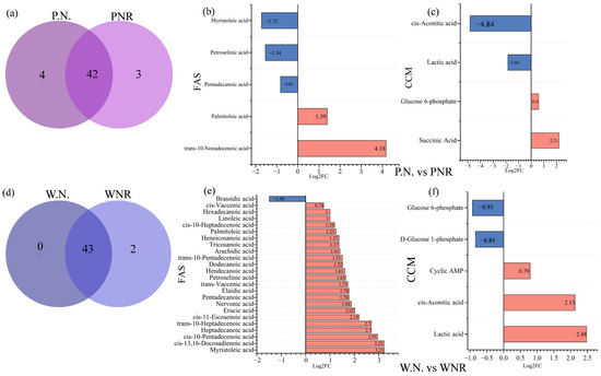 Differences in F.A. species among roots and nodules, as shown by Venn diagram and bar chart. (a,d) are Venn diagrams of common fatty acids in pn and PNR, wn and WNR, respectively; (b,e) are the bar graphs of the number of up-and down-regulated fatty acid metabolites in P.N. vs. PNR and W.N. vs. WNR; (c,f) are the bar graphs of the number of up-and down-regulated carbon metabolites in the difference center of P.N. vs. PNR and W.N. vs. WNR.