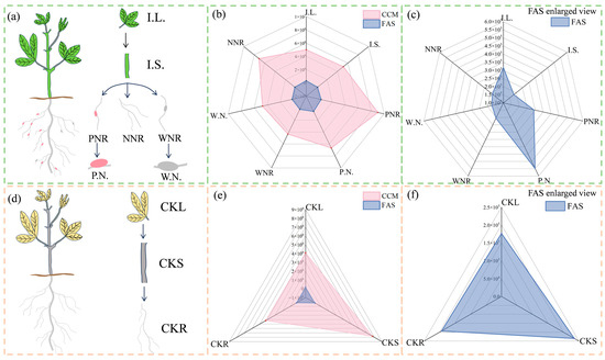 The total fatty acid and central carbon metabolite content from different plant parts. (a,d) represent energy utilization patterns of symbiotic and C.K. plants; (b,e) show radar maps of total fatty acid and central carbon metabolite content in symbiotic and C.K. plants; (c,f) show radar maps of total F.A. metabolite content for C.K. plants shown in (b,e).