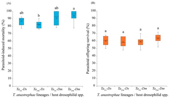 Percentage of host-killing capacity (Drosophila suzukii and D. melanogaster) (A) and offspring survival (B) of two Trichopria anastrephae population lineages under no-choice tests. Meaning of abbreviations: TaDs − Ds = T. anastrephae reared on D. suzukii and recovered from D. suzukii puparia, TaDm − Ds = T. anastrephae reared on D. melanogaster and recovered from D. suzukii puparia, TaDs − Dm = T. anastrephae reared on D. suzukii and recovered from D. melanogaster puparia, TaDm − Dm = T. anastrephae reared on D. melanogaster and recovered from and recovered from D. melanogaster puparia. The same lowercase letters indicate no significant differences at p > 0.05 (Dunn’s test).