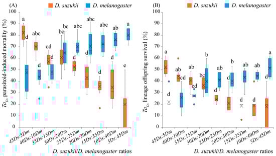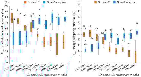 Percentage of host-killing capacity (A) and offspring survival (B) of the Trichopria anastrephae population lineage reared on D. suzukii (TaDs) at different D. suzukii (Ds):D. melanogaster (Dm) ratios under choice tests. The same lowercase letters indicate no significant differences at p > 0.05 (Dunn’s test).