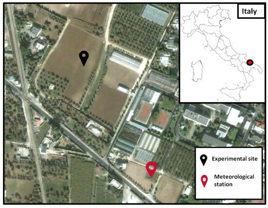The data were collected from field experiments conducted in 2009 and 2010 at the Mediterranean Agronomic Institute of Bari (CIHEAM-Bari), located in Valenzano, Southern Italy (41°03′16″ N, 16°52′ E, 72 m altitude) (Figure 1). According to the Köpper–Geiger classification [54], the research area has a Mediterranean climate. The average annual precipitation over 30 years is approximately 550 mm, mainly concentrated in autumn and winter seasons. An automatic agro-meteorological station collected daily meteorological data near the field trail site. The dataset included maximum and minimum air temperature (Tmax and Tmin), solar radiation (Rn), maximum and minimum air relative humidity (RHmax and RHmin), wind speed at 2 m height (U2) and precipitation (P).