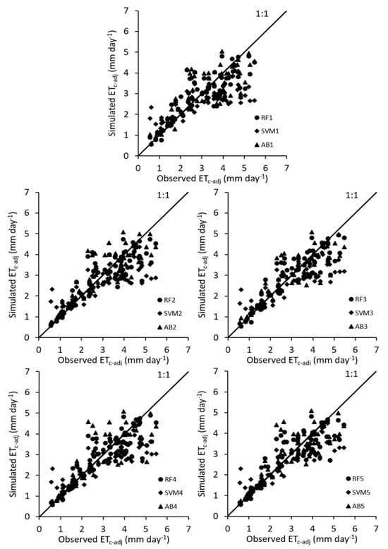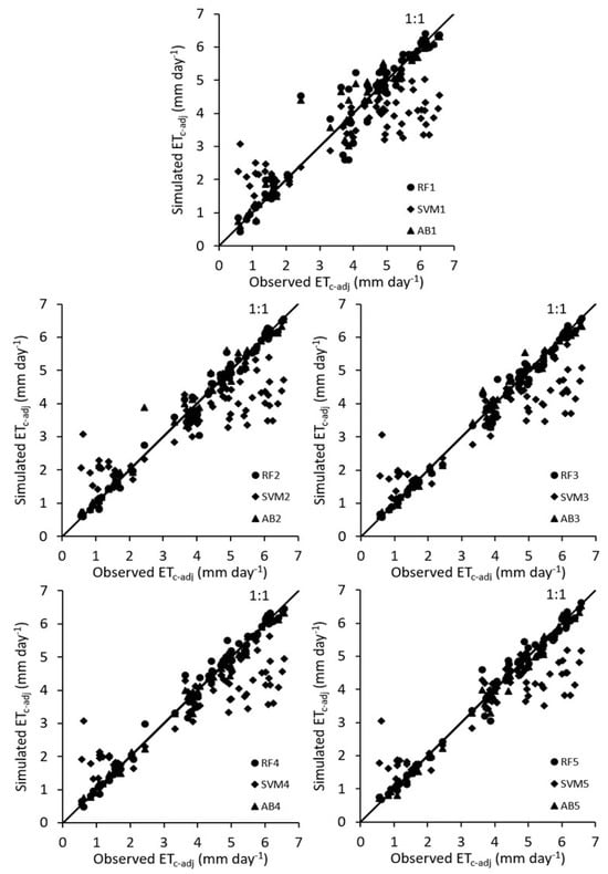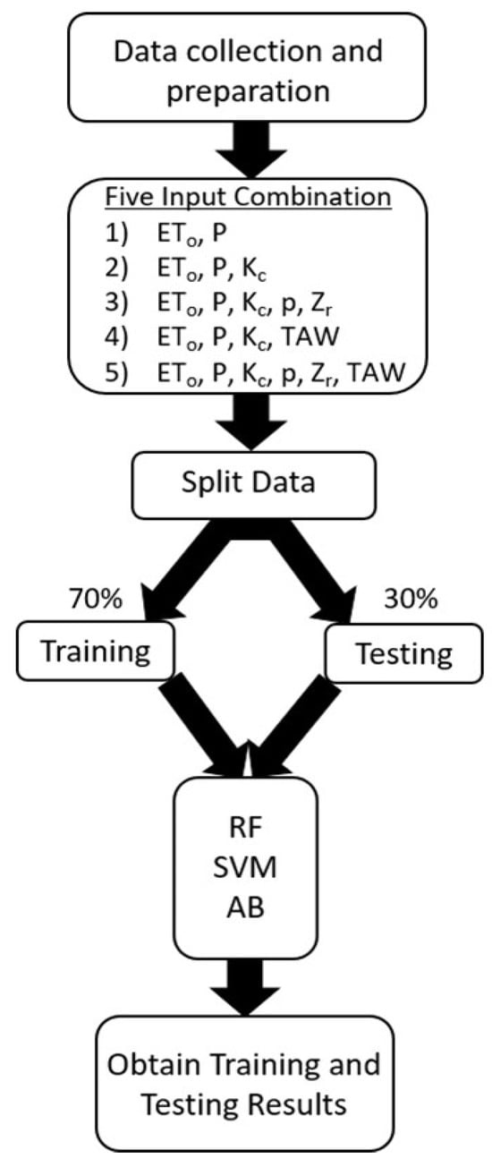The AB model offered the best prediction accuracy for four out of five scenarios of data availability, while the RF model offered the best prediction accuracy for the scenario where weather and crop coefficient data were available under optimal irrigation regimes (I100). In the case of deficit irrigation and 50% of the optimal irrigation supply (I50), the RF model was superior for all scenarios of data availability. Under the rainfed condition, the RF model fed only with climate data had better prediction accuracy than SVM and AB models. However, the AB model had the best performance for the other four scenarios of data availability. In general, the machine learning models demonstrated better prediction of crop evapotranspiration under rainfed (I0) and optimal irrigation regimes (I100) than under deficit irrigation (50% of the optimal irrigation regime).