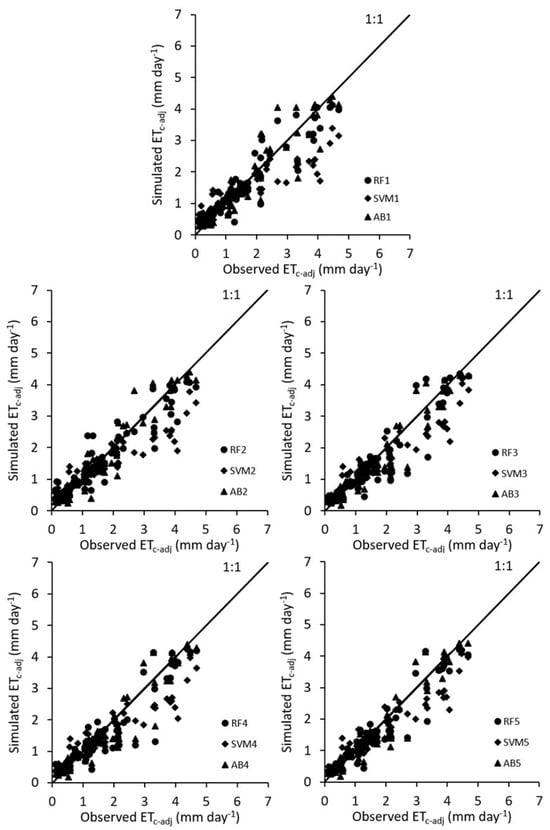 The statistical results of crop evapotranspiration estimate under optimal irrigation (I100) using RF, SVM and AB models with five scenarios of climate, crop and soil input data are presented in Table 4 for training and testing subsets. The estimated ETc (I100) values varied significantly according to model types and input data availability scenarios. In general, among the scenarios, the SVM model showed the weakest performance confirmed with the lowest R2 and EF and the highest MSE, RMSE and MAE in all scenarios for training and testing subsets. In contrast, the AB model for the first (AB1), third (AB3), fourth (AB4) and fifth (AB5) scenario obtained better statistical performance compared to the other two models. For the second scenario, fed with climate data (ETo and P) and limited crop data (Kc), the RF2 model demonstrated the best performance.