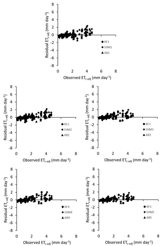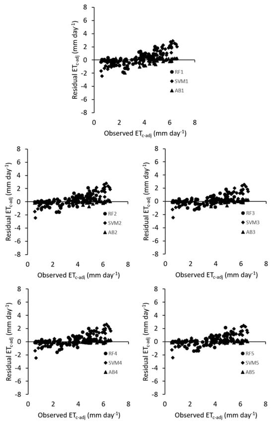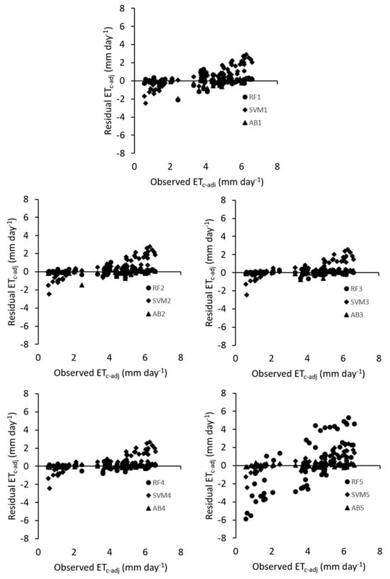 An evaluation of simulated and observed ETc-adj (I0) values for RF, SVM and AB models is shown in Figure 5. In all scenarios, the SVM model indicated a more scattered prediction than other machine learning models, as well as a noticeable overestimation. The ETc-adj (I0) values estimated by the first scenario of the RF model and second, third, fourth and fifth scenarios of the AB model were closer to the observed values and followed the trend of a 1:1 regression line. These findings agree with statistical indicators (Table 6). The residual plots of ETc-adj (I0) values by RF, SVM and AB models are shown in Figure 9. The residual plot showed that the most errors occurred in scenario 1, while the least errors occurred for scenarios 3 and 5.