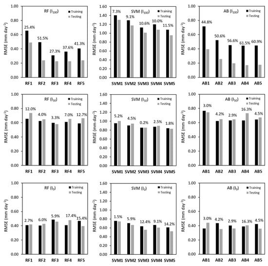The training and testing RMSE values of three water regimes (I100, I50 and I0) are demonstrated in Figure 10 for all the applied machine learning models. In general, the RF and AB models provided better prediction than the SVM model for all input scenarios. The change in testing RMSE over training RMSE is shown in Figure 10. The RF and AB models with all scenarios under optimal irrigation regimes (I100) had the largest percentage differences between training and testing RMSE values (from 25.4% to 61.5%). In the case of limited water supply (deficit irrigation and rainfed cultivation), the percentage difference between training and testing RMSE values was small (from 0.2% to 17.4).