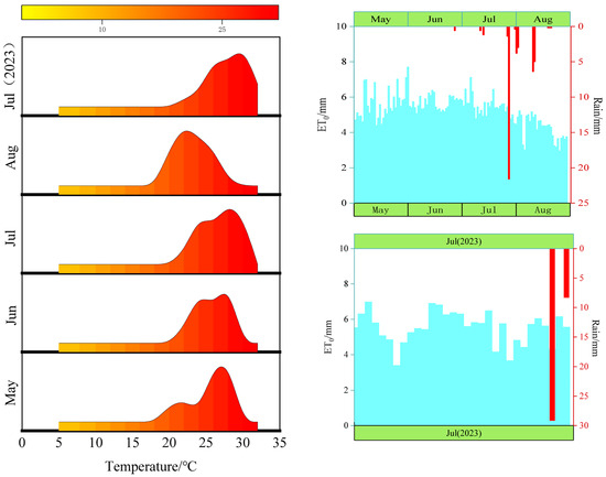 The variety was 5-year-old ‘Royal Gala’ with row spacing of 3.5 m × 1 m and plant height of about 4.5 m. The plant was grown in the same row. Five irrigation ratings of 13.5 mm (W1), 18 mm (W2), 22.5 mm (W3), 27 mm (W4), and 31.5 mm (W5) were set up, and the irrigation regime was as shown in Table 2. Figure 2 shows the temperature and rainfall during the experimental period of 2022 and 2023. The drip irrigation method was one row and one pipe, with a drip head flow rate of 4 L/h, a drip hole spacing of 30 cm, and drip pipes arranged on bamboo poles 50 cm above the ground.
