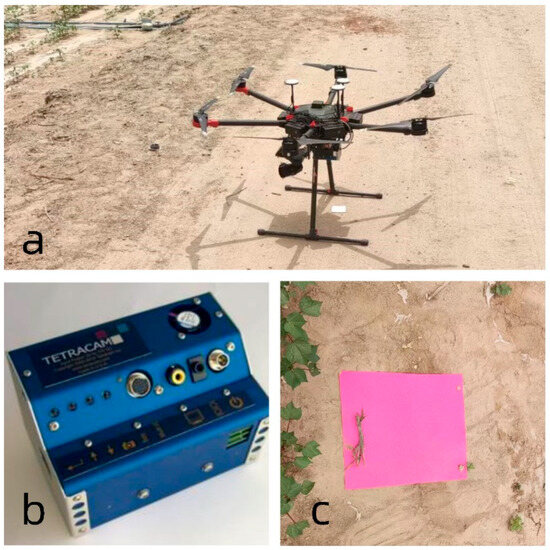 (a) aerial drone; (b) Micro-MCA Snap multispectral camera; (c) ground identification mark.