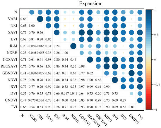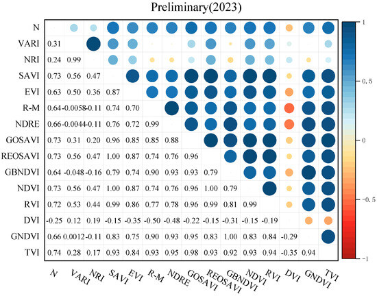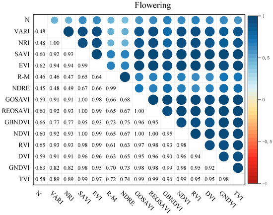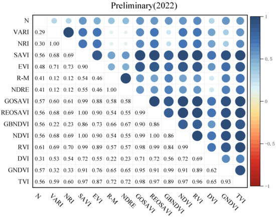 In this study, Pearson’s phase relationship was used to analyze the correlation between canopy leaf nitrogen content and the vegetation index of fruit trees. Origin was used to produce correlation heatmaps, and the numbers indicate the correlation between them; when the correlation is higher, the corresponding pattern is larger and darker. Figure 5, Figure 6 and Figure 7 show the correlation between the leaf nitrogen content of fruit trees and vegetation indices in 2022 for each reproductive stage. The results show that among the 14 vegetation indices selected, the leaf nitrogen content of fruit trees in each reproductive stage was positively correlated with vegetation indices, and the correlation was concentrated in the range between 0.4 and 0.7. Figure 8 shows the correlation between the N content of fruit trees and vegetation indices during the pre-fruit expansion period in 2023, and the results showed that all vegetation indices except DVI were positively correlated with N content.