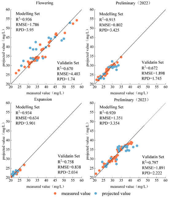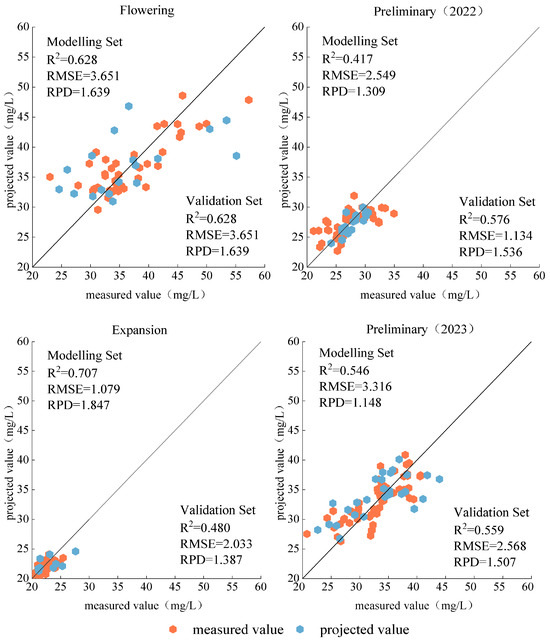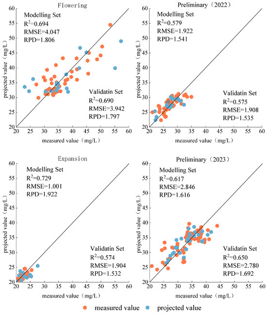 Figure 9 shows the estimated model for estimating the canopy leaf nitrogen content of fruit trees at each fertility stage using the PLSR model. During the three fertility periods of fruit trees in 2022, pre-fruit expansion and post-fruit expansion, the validation set R2 varied in the range of 0.574 to 0.575, and the RMSE varied in the range of 1.904 mg·L−1 to 1.908 mg·L−1, indicating that the accuracy of estimation using the PLSR model was similar during these two fertility periods. And at flowering and fruiting, it had a validation set of R2 = 0.690 and RMSE = 3.942 mg·L−1, and at pre-fruit expansion in 2023, it had a validation set of R2 = 0.650 and RMSE = 2.780 mg·L−1. As far as the modeling set is concerned, the best fertility period for predicting the leaf nitrogen content of fruit trees using the PLSR model was the late fruit expansion stage in 2022. It had the highest modeling set R2 and the smallest RMSE among all the fertility periods, with R2 = 0.729, RMSE = 1.001 mg·L−1, and RPD = 1.922, which had a certain prediction effect.