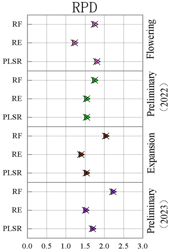The RPD of the validation set was further utilized to assess the accuracy of the estimation of canopy leaf nitrogen content of fruit trees at various fertility stages, as shown in Figure 12. At the flowering and fruiting stage in 2022, the highest accuracy was predicted using the PLSR model, which had a predictive effect of RPD = 1.797 (>1.4), followed by the RF model, which had a predictive effect of RPD = 1.74 (>1.4), and lastly, the RR model, which had a predictive effect of RPD = 1.639 (>1.4). In the pre-expansion period of 2022, the highest accuracy was obtained by using the RF model, which had an RPD = 1.745 (>1.4), followed by the RR model and the PLSR model, which had an RPD = 1.536 (>1.4) and 1.535 (>1.4), respectively, indicating that both of them had similar prediction effects. At the late fruit expansion stage in 2022, the highest accuracy was obtained using the RF model with an RPD = 2.034 (>1.4), followed by the PLSR model with an RPD = 1.532 (>1.4), and lastly, the RR model with an RPD = 1.387 (<1.4), indicating that the model was not effective in prediction at this fertility stage. In 2023, the best prediction in the pre-expansion stage of the fruit was made using the RF model, which had an RPD = 2.222 (>1.4), followed by the PLSR model, which had an RPD = 1.692 (>1.4), and lastly, the RR model, which had an RPD = 1.507 (>1.4), which was effective in making a prediction. Overall, the RF model was used to predict the canopy leaf nitrogen content of fruit trees with good predictive effect at all fertility stages.