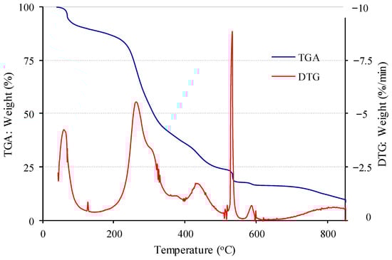 The results for the characterisation of the sorbent are shown in Figure 1, Figure 2, Figure 3 and Figure 4 and Table 1. Figure 1 shows the TGA/DTG profiles obtained for broccoli biomass where different processes can be distinguished, contributing to a total weight loss of 89.9%: (a) the first loss of 11% due to moisture removal, meaning the presence of significant hydrophilic functional groups until 148 °C [58]; (b) the loss of 47.9% up to 400 °C and 16.4% up to 500 °C due to the removal of volatile materials (principally hemicellulose and cellulose, respectively); and (c) the pyrolysis of the more stable lignins in the range of 500–600 °C with a loss of 8.0%; this high thermal stability of lignin may be due to the formation of pseudolignin [59]. Also, the pyrolysis of char produced from the thermal degradation of pectins and hemicelluloses may be involved in this loss of weight [60]. The pyrolysis analysis was over at 850 °C with a low weight loss of 6.7%. The ash weight at 850 °C was 9.7% of the initial biomass.