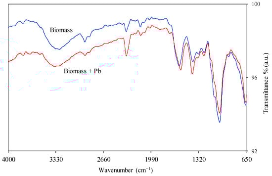 In relation to the functional groups, the pH of the biomass was found to be 6.88 ± 0.02, the pHpzc value was 6.25 ± 0.02 (data in Table S5 of Supplementary Material), and the conductivity of the biomass was 1566 ± 22 µS cm−1 (Table 1). These pH values have a great importance in metal sorption because they determine the ionization of the chemically active sites in the sorbent and the charge of the sorbent surface during sorption processes, affecting the sorption mechanism. Its quantification is of great importance when the main process is physisorption and provides information on the affinity of the biomass for cationic or anionic species depending on the pH of the liquid phase [86]. Thus, at solution pH higher than pHpzc = 6.25, the biomass surface will be negatively charged, facilitating the interaction with positive species, while at pH lower than this value, the behaviour of the solid surface will be the opposite. Lower or similar values can be found in the literature for other biomasses used for Pb biosorption: blue-green algae (pHpzc 1.3) [77], corncob-activated carbon (pHpzc 3.8) [78], nanche stone (pHpzc 6) [80], mixture of coffee grounds and orange barks residues (pHpzc 5.2) [87], olive stone (pHpzc 6.61) [88] or untreated and alkaline-treated apricot shell (pHpzc 4.9 and 5.7, respectively) [89].