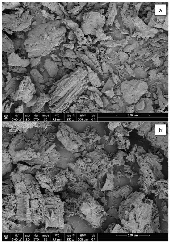 SEM micrographs of the surface morphology of broccoli stalk biomass before (a) and after (b) Pb(II) sorption.