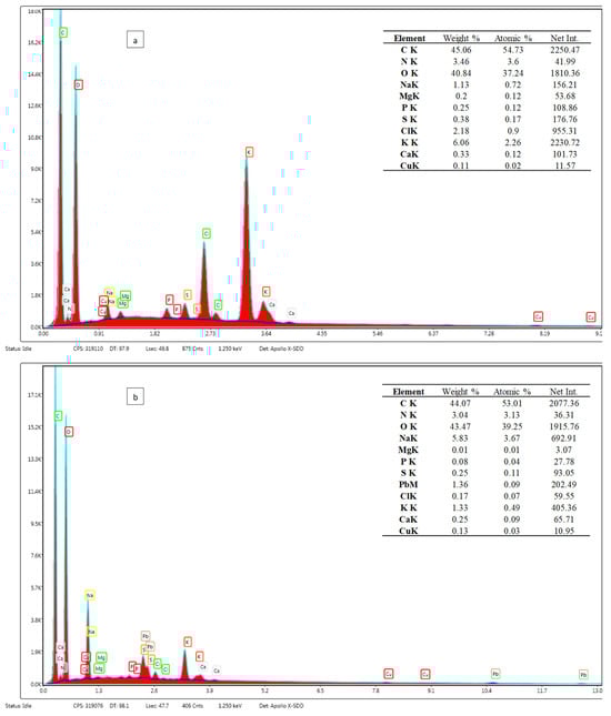 EDX spectra of broccoli stalk biomass before (a) and after (b) Pb(II) sorption.