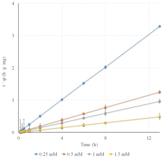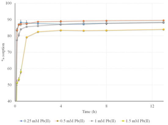 The removal of Pb(II) at different concentrations of 0.25, 0.5, 1, and 1.5 mmol L−1 was studied over time. The experiments were conducted under the conditions mentioned in Section 2.4, at pH 4.8 and 23 °C, using 0.5 g of biomass (particle sizes: 0.125 mm < x < 0.249 mm) in 50 mL of aqueous solution. The percentage of Pb(II) removal was calculated with Equation (2) and the experimental data obtained are shown in Figure 5. It can be observed that Pb(II) removal increased rapidly with time during the initial intervals, followed by a slower increase until equilibrium was reached. This effect decreased at higher concentrations, requiring more time to reach equilibrium. The removal efficiency does not seem to increase with the increasing concentration gradient from the solution to the sorbent, as occurs mainly in physical processes, which rely more on diffusion. Equilibrium was reached after 6–8 h for all initial concentrations, making it unnecessary to extend the removal times. The percentage of removal at equilibrium was similar in the range of 0.25–1 mmol L−1 Pb(II), with an average of 88.1 ± 1% after 6 h and 88.3 ± 0.8% after 8 h, with lower yields for 1.5 mmol L−1 Pb(II) of 83.2 ± 0.1% after 6 h and 83.4 ± 0.3% after 8 h. When the Pb(II) concentration was too high, this efficiency was slightly lower, probably due to the saturation of the binding sites on the biomass. The precision of the method was evaluated using a concentration of 1 mmol L−1 of Pb(II) by six replicate measurements at a confidence level of 95%, and was found to be 0.23%.