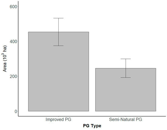 Using data from aerial photography interpretation in 380 3 km × 3 km landscape squares, we estimated that approximately 453,000 ha of managed PG in Sweden is agriculturally improved, and 246,000 ha is semi-natural (Figure 2). This means that the total area of land managed as permanent grassland in Sweden could be more than three times higher in reality compared to the situation in which only semi-natural grasslands are considered as PG (according to our aerial photo interpretation).
