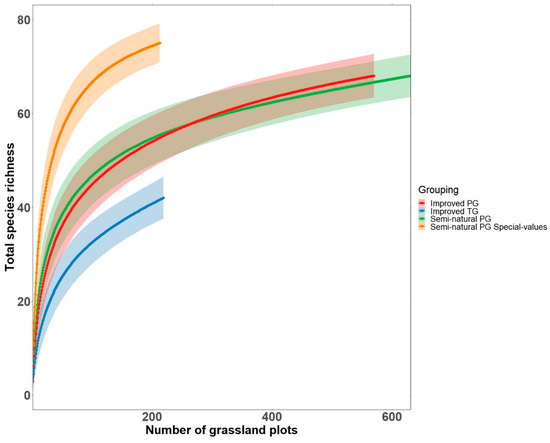 The species accumulation curves of total vascular plant species richness for our four grassland categories showed a clear difference across grassland types (Figure 3), with the grassland category for AES of special value supporting the highest level of plant species richness. The species accumulation curves followed a similar trajectory for improved PG and semi-natural PG plots from grasslands without special value AESs, indicating similar total species richness in these types across all plots. Species lists with the number of plots where species were registered for each grassland type are available in the Supplementary Materials.