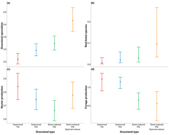 Four vascular plant community-based biodiversity and ecosystem service indicators in four grassland types reflecting (a) indicator specialist species for semi-natural grasslands, (b) red-listed vascular plant species, (c) nectar producing plants (resource for pollinators), and (d) forage amount (cover of grassland vegetation available for forage). Figures are the result output from separate GLMMs for each indicator calculated using sample plot data from Remill (n = 1621).