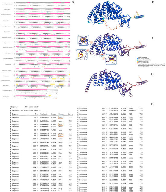 Structural analysis of OsCSN1. (A) Secondary structure comparison of OsCSN1 in rice and Arabidopsis, where P represents phosphorylation site and U represents ubiquitination site. (B) Prediction of OsCSN1 tertiary structure. (C) Prediction of OsCSN1DN32 tertiary structure. (D) Prediction of OsCSN1DN102 tertiary structure. (E) Prediction of OsCSN1 phosphorylation sites.