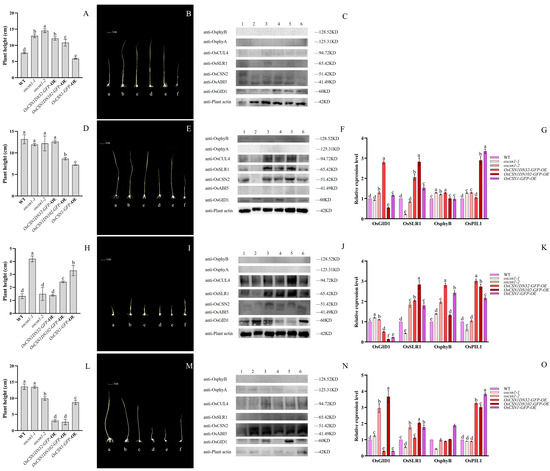 After treatment with red light with PAC (Figure 2K), the results of the fluorescence quantification showed that the OsSLR1 expression levels in the OsCSN1DN102-GFP-OE mutant and OsCSN1DN32-GFP-OE mutant were significantly upregulated. In contrast, those in the OsCSN1-GFP-OE and OsCSN1DN32-GFP-OE mutant were significantly upregulated. The upregulation trend of the oscsn1-2 mutant was similar, whereas that of the oscsn1-1 mutant showed a trend toward downregulation. Moreover, OsGID1 in the oscsn1-1 and oscsn1-2 mutants tended to be downregulated, and the OsGID1 gene tended to be downregulated in the other overexpression mutants, regardless of whether the N-terminus of OsCSN1 was deleted. After the addition of PAC, the oscsn1-1 mutant had the lowest expression levels of OsSLR1 and OsABI5, and the expression levels of the remaining mutants were greater than those of the WT. Similarly, the expression levels of OsSLR1 and OsABI5 in the oscsn1-2 and OsCSN1DN32-GFP-OE mutants were more significant than those in the WT (Figure 2J).
