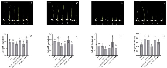 A previous study showed that red light could inhibit plant coleoptile elongation [34]. However, under red-light treatment, the number of coleoptiles of the OsCSN1DN102-GFP-OE mutant, OsCSN1DN32-GFP-OE mutant, oscsn1-1 mutant, and oscsn1-2 mutant increased significantly compared to that under light treatment, indicating an inhibitory effect of red light on the coleoptiles of rice plants. However, this effect was not significant. The expression of the OsCSN1-GFP fusion protein was detected in the coleoptile of the OsCSN1-GFP-OE mutant, and the elongation of the coleoptile was significantly inhibited, indicating that the OsCSN1-GFP-OE mutant is sensitive to red light (Figure 3C,D and Figure S2B). These results indicate that the inhibitory effect of red light on rice coleoptile elongation requires the participation of intact OsCSN1.