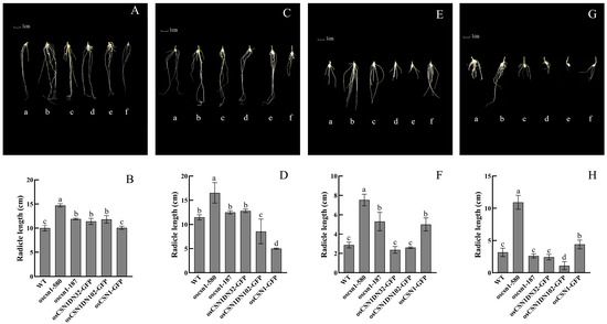 After 9 days of growth, the WT and samples were measured for plant height, root length, and embryonic sheath length during the seedling stage. All measurements in each group were repeated 5 times (N = 5). Data are presented as mean ± standard error for the control and experimental groups. Statistical significance was set at p ≤ 0.05. Experimental data were analyzed using Excel 2019 and Statistical Product Service Solutions 28.0 (SPSS, https://www.ibm.com/cn-zh/products/spss-statistics, accessed on 25 May 2023), and graphs were plotted using GraphPad Prism 8 (https://www.graphpad-prism.cn/, accessed on 25 May 2023).