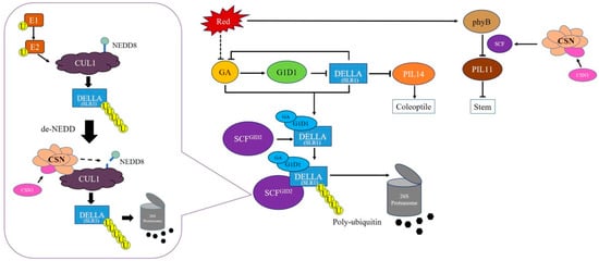 Red light may regulate the degradation of SLR1 and PIL14 through the ubiquitin/26S protease pathway, eventually inhibiting the elongation of the coleoptile. OsCSN1 promotes the degradation of SLR1 and PIL14 by forming CSN and modifying it with RUB/NEDD8, an E3 ligase of CUL1 (Figure 5). This process eventually affects the elongation of coleoptiles.