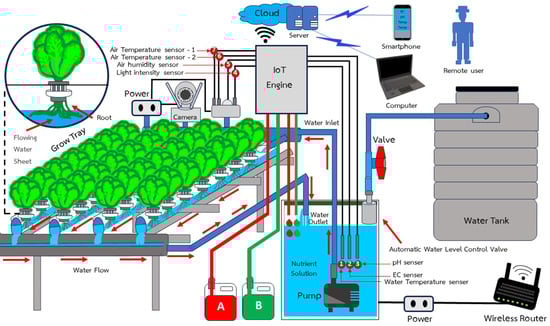 Figure 2). The system consists of seven sensors, including an electrical conductivity (EC) sensor (DFRobot, Shanghai, China), a pH sensor (DFRobot, Shanghai, China), two air temperature sensors (Aosong Electronics Co., Ltd., Guangzhou, China), a water temperature sensor (Analog Devices, Wilmington, MA, USA), an air humidity sensor (Aosong Electronics Co., Ltd., Guangzhou, China), and a light intensity sensor (ROHM Semiconductor, Kyoto, Japan). The types of sensors, models, and technical specifications used in this study are shown in