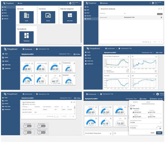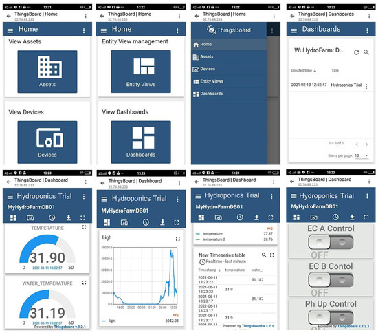 The ThingsBoard platform version 3.2.1 is used for controlling sensors and actuators, including nutrient solution pumps and pH control pumps. It enables remote monitoring, data visualization, and automatic system operation based on predefined parameters. The system is configured as an Internet of Things (IoT) network, allowing remote monitoring and control. It can automatically check and report on the server’s status and perform a restart if necessary. The IoT network enables users to view received data and receive user commands. The Smart Hydroponic Board is designed to enable users to control motor activation and deactivation. The displayed values change with real-time updates reported every 5 s. Furthermore, the system can be controlled conveniently through mobile phones, enhancing user control. Users can also inspect parameters similarly to using a computer. Additionally, the system includes cameras for day and night monitoring to assess plant growth. It can also capture images of intruders and send alerts to phones, facilitating communication with farm workers through the camera system. In the event of unforeseen incidents such as power outages or electrical failures, which might lead to sensor malfunctions or electronic component failures affecting the system’s operation, data will not be lost or halted. The software records data, allowing retrieval for analysis at a later time.