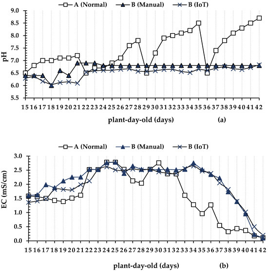 22]. Comparing this to the IoT cultivation system, which maintains a consistent pH level through continuous monitoring and adjustment (every 5 s), results in healthier growth due to optimized nutrient absorption. Increasing electrical conductivity (EC) can impede nutrient absorption in plants by raising the osmotic pressure of nutrient solutions, rendering nutrients unusable and potentially releasing them into the environment, thus contributing to pollution. Conversely, low EC values can negatively impact plant health and productivity [