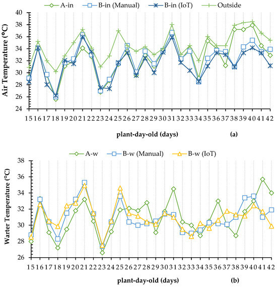 24]. Conversely, temperatures lower than 40 °C are considered optimal. Experiments showed that outdoor temperatures were 1–2 degrees Celsius higher than indoor temperatures. Inside both cultivation houses, the maximum temperature remained near 38 °C, as controlled by shade netting within the greenhouse to prevent excessive heat. Moreover, the water temperature was observed to be 1–2 °C lower than the air temperature, regulated by a water controller. The experiments revealed that the maximum water temperature was around 36 °C, which did not significantly affect the root growth of plants. As a result, both normal cultivation and IoT cultivation showed similar root growth. However, excessively high water temperatures can lead to decreased oxygen availability in water, potentially causing oxygen deficiency in the roots. Therefore, controlling water temperature appropriately is a crucial factor.