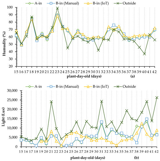 23]. In general, conventional cultivation saw rapid decreases in EC during weeks 3 and 4 of Chinese cabbage growth, leading to suboptimal growth compared to IoT cultivation. The IoT system slowly decreased EC values over the fourth week, maintaining an environment conducive to healthy growth. A suitable temperature is pivotal for photosynthesis and respiration processes in plants. Temperatures exceeding 40 °C generally limit carbon assimilation during photosynthesis and can cause physiological stress [