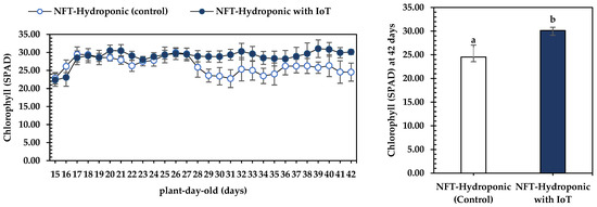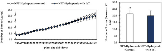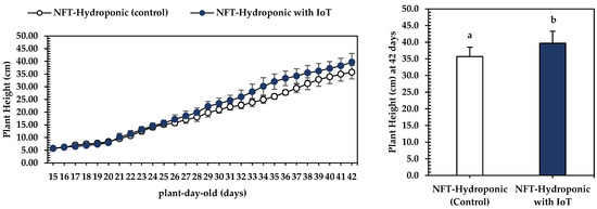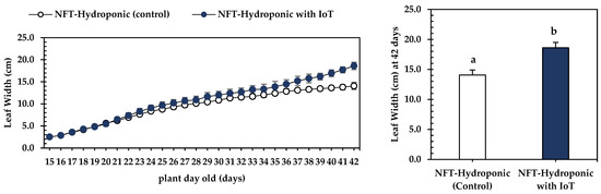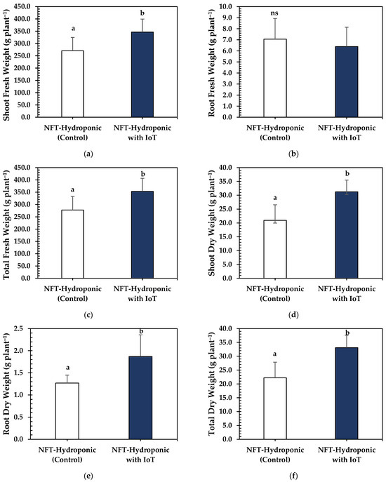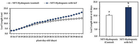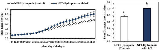 −1. This strengthens the argument for the effectiveness of the smart farm system in promoting superior growth. The IoT hydroponic cultivation showed a 27.14% increase in total fresh weight and a 48.90% increase in total dry weight, suggesting a significant improvement in overall plant biomass production. This could be attributed to factors like optimized nutrient delivery, precise control over environmental conditions (light, temperature, and humidity), and potential disease or pest reduction by the smart farm’s automation. The findings also indicate improved vegetative growth parameters. The increase in plant height (11.14%), stem diameter (32.89%), leaf area (94.30%), leaf width (32.36%), and leaf length (38.12%) suggest a healthier plant with a potentially higher yield (