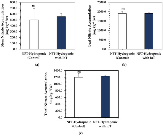 28]. Results indicated that conventional hydroponic cultivation accumulated 1199.50 milligrams per kilogram of nitrate, while IoT hydroponic cultivation accumulated 1233.50 milligrams per kilogram. Both of these values were below 50% of the EU standard. Furthermore, when compared to other cultivation methods in Thailand, such as hydroponics, organic farming, and soil-based cultivation, both IoT and conventional hydroponic cultivations had significantly lower nitrate accumulation, with IoT hydroponics achieving a 22.73% reduction.